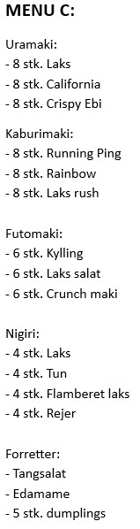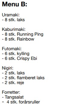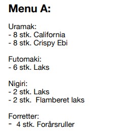 Ændringer koster 20 kr. ekstra pr. rulle og 5 kr. pr. nigiri. Kun retter af samme kategori kan ændres. Ved allergener bedes De kontakte restauranten. Spisepinde og soya udleveres i det antal som passer sushimenu'en. Ekstra pinde/soya kan tilkøbes